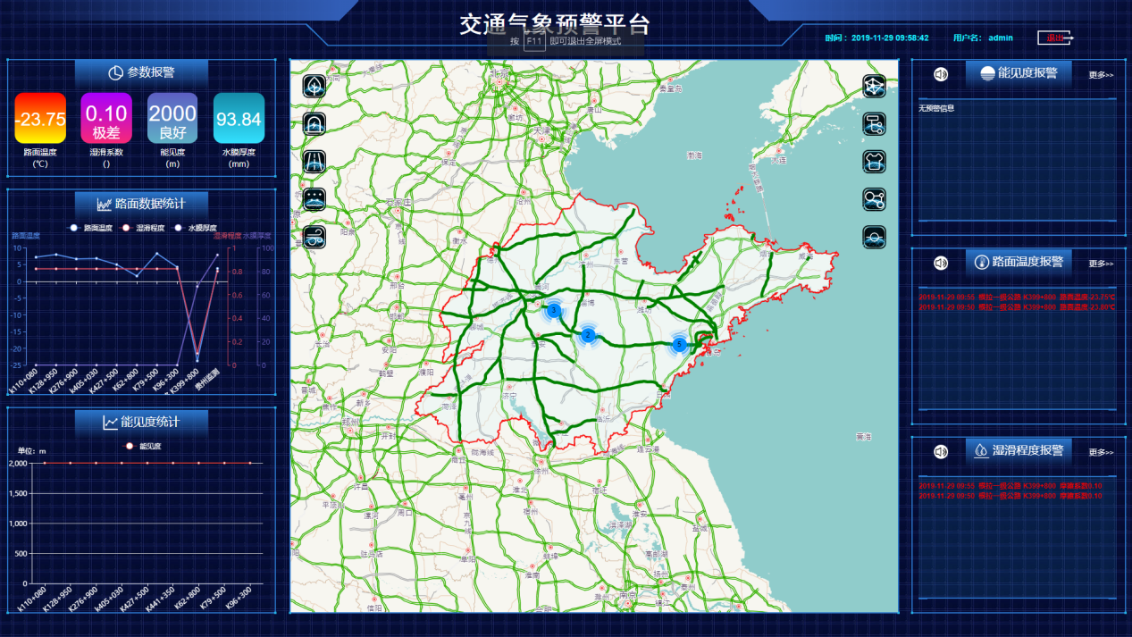 該平台是(shì)一(yī)個(gè)氣象預警•平台,通(tōng)過收集安裝在高(gāo)速公路(lù)上(shàng)的(de)氣象站(zhàn)、路(lù)面探測器(qì)、能(néng)見(jiàn)度儀等硬件(jiàn)數(shù¥)據并進行(xíng)解析,能(néng)夠實時(shí)反映相(xiàng)應的(de)道(dào)路(lù)交通(tōng)氣象路(l ù)況信息,并顯示在管理(lǐ)平台上(shàng),讓管理(lǐ)者實時(shí)掌握對(duì)應路(lù)面氣象狀況。